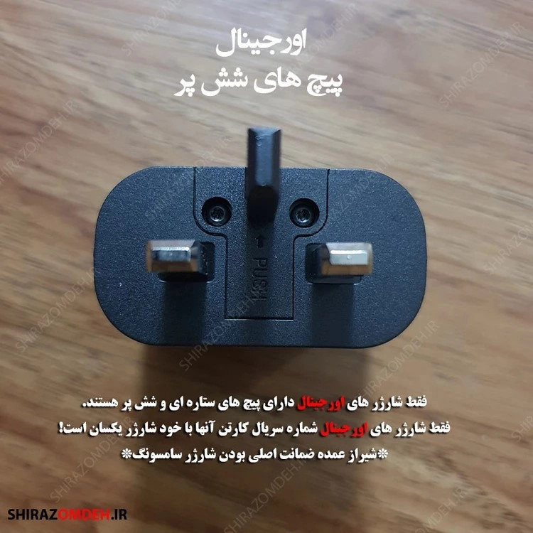 - راه دیگر تشخیص اصلی بودن شارژر از برجستگی نوشته های روی کارتن و کیفیت چاپ عبارت های انگلیسی بروی کارتن میباشد، زیرا محصولات فیک از کیفیت چاپ و جنس بکار رفته کارتنی پایینی برخودارند.