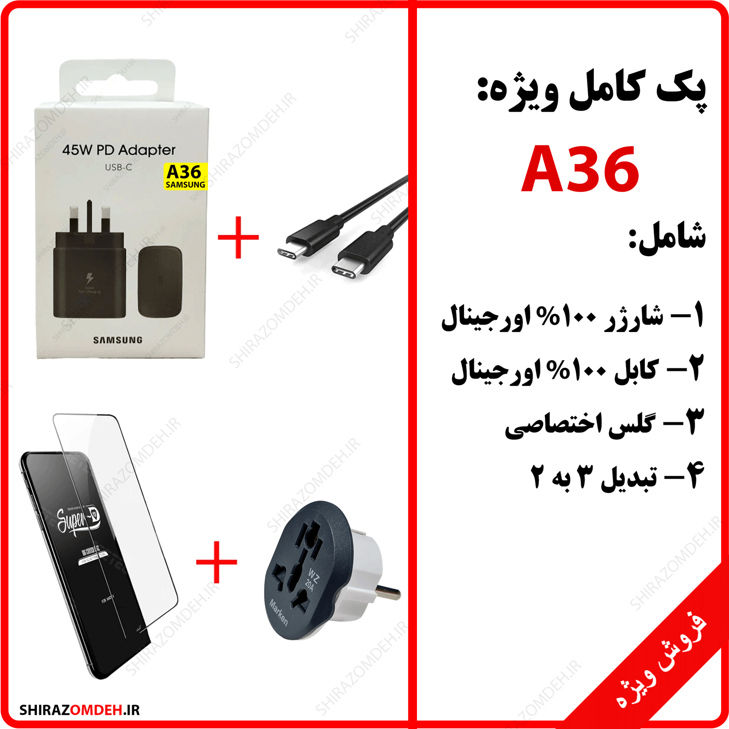 شارژراصلی 45وات.کابل اصلی تایپ سی.گلس محافظ ضد ضربه.تبدیل برق مارکن 3به2.
